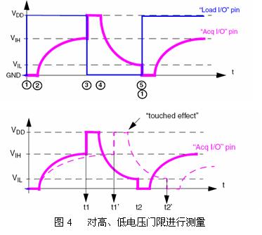 為了提高系統(tǒng)的可靠性和穩(wěn)定性,改進(jìn)的測(cè)量方法是對(duì)Vout進(jìn)行高和低兩個(gè)門(mén)限進(jìn)行測(cè)量。如圖4所示,通過(guò)對(duì)t1和t2的測(cè)量,從而達(dá)到更可靠的效果。另外,多次測(cè)量也是有效的降低高頻干擾的有效方法。