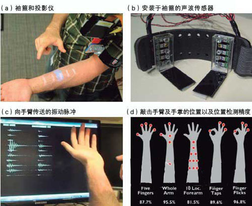 Harrison與美國微軟研究院(Microsoft Research)的研究人員開發(fā)出了以手及手臂表面作為觸摸面板的技術“Skinput”。“我們試制了一個可實際運行的系統(tǒng)”(Harrison)。只需用手指在手掌及手臂等的表面輕輕敲擊,即可操作游戲機、音樂播放器及手機等。