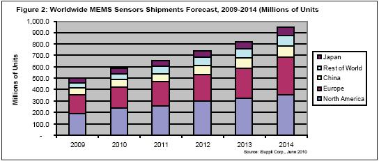 鑒于中國(guó)汽車出貨量迅速增長(zhǎng),在該地區(qū)已經(jīng)建立據(jù)點(diǎn)的供應(yīng)商,如Bosch和Continental,都逃過(guò)了經(jīng)濟(jì)衰退的最嚴(yán)重影響。2009年中國(guó)市場(chǎng)占總體MEMS消費(fèi)量的11%,未來(lái)幾年將繼續(xù)增長(zhǎng),到2014年將成為全球第三大市場(chǎng),領(lǐng)先于日本和“世界其它地區(qū)”。iSuppli公司認(rèn)為,這些動(dòng)態(tài)未來(lái)五年對(duì)于MEMS傳感器供應(yīng)商來(lái)說(shuō)是好消息。