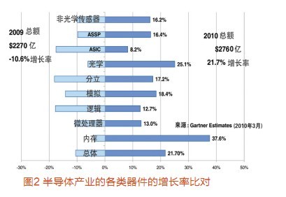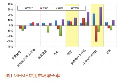 Gartner公司調查總監(jiān)Stephan Ohr從宏觀上分析了MEMS的增長態(tài)勢。Gartner把MEMS分為光學和非光學兩大類。光學MEMS如TI公司的DLP(數(shù)字投影芯片)。非光學MEMS傳感器年增長率16.2%(圖2),2010年市場容量會突破30億美元,有望達到31億美元;2009年為28億美元。其中,汽車應用仍然保持非光學傳感器的第一位,占2009年總應用中的60%以上;但是數(shù)據(jù)處理和通信應用增長最快,數(shù)據(jù)處理包括硬盤的G-Force(重力)傳感器,通信中包括手機的可旋轉(rational)的傳感和基于位置的服務。
