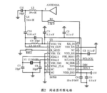 應(yīng)答器TAG-IT完全兼容ISO/IEC15693協(xié)議??▋?nèi)有64位的UID(卡號)和8位的AFI(應(yīng)用識別號)、8位的DSFID(數(shù)據(jù)存儲(chǔ)格式),其中UID是不可修改的。另外,卡內(nèi)有2KB的EEPROM,分成64塊,每塊32Bit,每個(gè)塊均可鎖定,以保護(hù)數(shù)據(jù)免于修改。射頻系統(tǒng)的閱讀器電路設(shè)計(jì)圖如圖2所示。