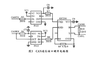 CAN通訊網(wǎng)絡(luò)模塊負(fù)責(zé)將啟動(dòng)信號和檢測信號通過CAN網(wǎng)傳輸給汽車的中央處理器。中央處理器通過接收的信號做決策判斷。CAN總線通信方式靈活、抗干擾能力強(qiáng),目前在汽車控制系統(tǒng)中應(yīng)用廣泛。CAN通訊接口硬件設(shè)計(jì)如圖3所示,其中82C250是CAN控制器和物理總線間的接口,它和CAN控制器之間采用光隔P113來提高系統(tǒng)的抗干擾能力。