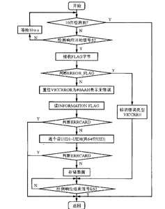 在MCU讀TAG-IT期間,由S6700掌握時(shí)鐘線控制權(quán)。S6700讀得數(shù)據(jù)后,通過DIN傳輸給MCU。在讀取數(shù)據(jù)時(shí),MCU必須嚴(yán)格模擬TAG-IT的響應(yīng)時(shí)序,并通過傳輸來的FLAG來確定數(shù)據(jù)的正確性。只有在FLAG完全正確時(shí),才會(huì)繼續(xù)接受響應(yīng)內(nèi)容,否則,系統(tǒng)將結(jié)束讀卡過程。圖5給出了讀應(yīng)答器的子程序圖。
