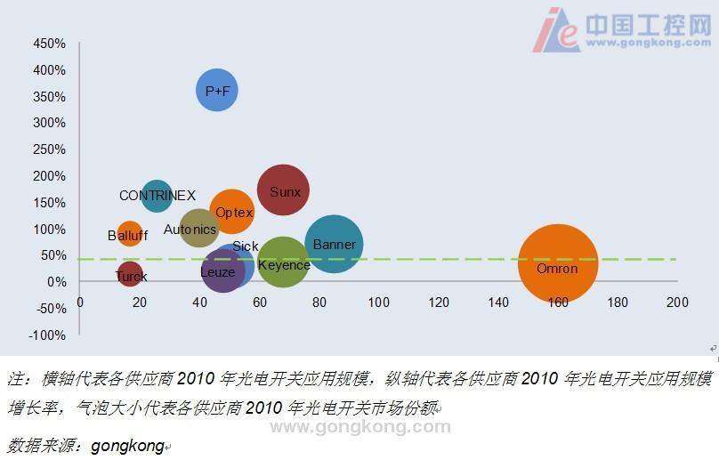 從廠商角度來(lái)看,各主流廠商表現(xiàn)的差異非常大。部分廠商,如Autonics、IFM光電開(kāi)關(guān)和接近開(kāi)關(guān)銷(xiāo)售業(yè)績(jī)的增長(zhǎng)幅度在100%以上,而還有部分廠商增長(zhǎng)只有10%左右。相比之下,編碼器的主流廠商業(yè)績(jī)?cè)鲩L(zhǎng)幅度雖然也有差距,但是差距相對(duì)較小,增長(zhǎng)幅度最大的為60%,增長(zhǎng)幅度最小的低于10%。但這些變化未改變傳感器市場(chǎng)的整體格局,Omron以全面的產(chǎn)品系列和普遍的實(shí)用性立足于大眾化市場(chǎng),市場(chǎng)份額仍遙遙領(lǐng)先于其他企業(yè)。歐美系品牌中,Turck、Sick和Banner定位于高端市場(chǎng),以先進(jìn)的技術(shù)和穩(wěn)定的質(zhì)量贏得冶金、汽車(chē)、物流等高端客戶(hù)的青睞。