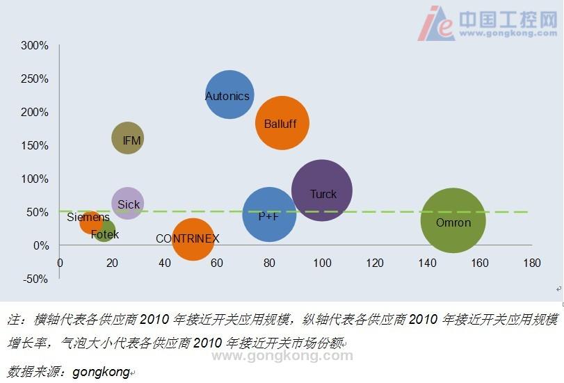 據(jù)gongkong《2011年中國(guó)離散傳感器市場(chǎng)研究報(bào)告》數(shù)據(jù)顯示,2010年離散傳感器市場(chǎng)迎來(lái)高速增長(zhǎng),市場(chǎng)規(guī)模達(dá)到34.5億人民幣,同比去年增長(zhǎng)43.7%,其中光電開(kāi)關(guān)和接近開(kāi)關(guān)的增長(zhǎng)幅度都超過(guò)了50%,編碼器增長(zhǎng)幅度也超過(guò)40%,皆為2007年以來(lái)的最高水平。