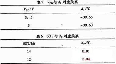 式中,d1和d2為特定系數(shù)。d1的取值與SHT11工作電壓有關(guān),d2的取值則與SHT11內(nèi)部A/D轉(zhuǎn)換器采用的分辨率有關(guān),其對(duì)應(yīng)關(guān)系分別如表5和表6所示。