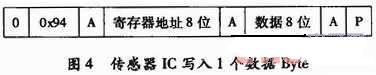 寫(xiě)數(shù)據(jù)格式:圖4所示為向傳感器IC寫(xiě)入1個(gè)字節(jié)數(shù)據(jù)時(shí)的正確幀格式。