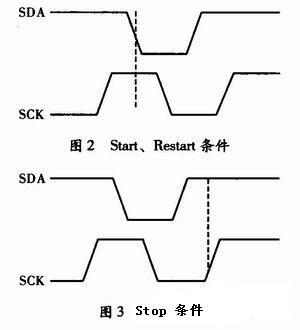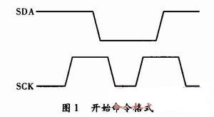 (1)傳輸開(kāi)始。在SCK為高時(shí)使SDA由高電平變?yōu)榈碗娖剑⒃谙乱粋€(gè)SCK為高時(shí)將SDA升高,如圖1所示。