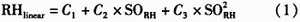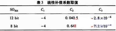 式中,RHlinear為經(jīng)過(guò)線性補(bǔ)償后的濕度值,SORH為相對(duì)濕度測(cè)量值,C1,C2和C3為線性補(bǔ)償系數(shù),取值如表3所示。