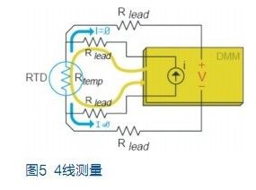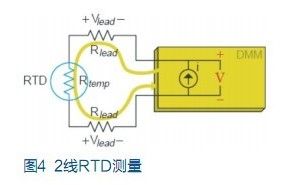 與熱敏電阻相似,鉑電阻溫度傳感器(RTD)也是用鉑制成的熱敏感電阻。當(dāng)通過測量電壓計(jì)算RTD 溫度時(shí),數(shù)字萬用表用已知電流源測量該電流源所產(chǎn)生的電壓。這一電壓為兩條引線(Vlead)上的壓降加RTD上的電壓(Vtemp)。例如,常用RTD 的電阻為100Ω,每1℃僅產(chǎn)生0.385Ω的電阻變化。如果每條引線有10Ω電阻,就將造成26℃的測量誤差,這是不可接受的。所以應(yīng)對RTD作4線歐姆測量。