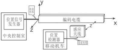 自動控制系統(tǒng)中,必須解決兩個基本問題:a.控制和受控雙方可靠的數(shù)據(jù)通信;b.移動機車所在位置的位置檢測。感應(yīng)無線位置檢測系統(tǒng),將感應(yīng)無線數(shù)據(jù)通信和位置檢測融合在一個系統(tǒng)中,它由位置信號發(fā)生器、編碼電纜、感應(yīng)天線、位置檢測器組成。其中感應(yīng)天線箱安裝在移動機車上隨機車移動,且始終與編碼電纜保持距離z;編碼電纜部分由編碼電纜、連接電纜、匹配阻抗構(gòu)成。感應(yīng)無線位置檢測系統(tǒng)框圖如圖1所示。