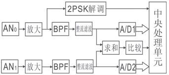 感應(yīng)無線位置檢測系統(tǒng)電路框圖如圖5所示。當(dāng)中控室地面局開始發(fā)送載波信號時,DCD=1;CPU檢測到DCD后,對2PSK解調(diào)輸出檢測,將第1個1作為起始位進(jìn)行串行數(shù)據(jù)接收,得到APD位置數(shù)據(jù)g;在檢測G0的時間段,啟動A/D1和A/D2,從A/D1和A/D2讀出接收線圈0接收的信號幅度A(AN0)和接收線圈1接收的信號幅度A(AN1),將各數(shù)據(jù)代入公式(5)~(8),可得移動機車位置ADD。