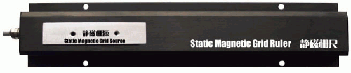靜磁柵位移傳感器由“靜磁柵源”和“靜磁柵尺”兩部分結(jié)合使用。“靜磁柵源”使用鋁合金壓封無(wú)源釹鐵硼磁柵組成磁柵編碼陣列;“靜磁柵尺”用內(nèi)藏嵌入式微處理器系統(tǒng)的特制高強(qiáng)度鋁合金管材封裝,使用開(kāi)關(guān)型霍爾傳感器件組成霍爾編碼陣列,鋁合金管材外部使用防氧化鍍塑處理。“靜磁柵源”沿“靜磁柵尺”軸線作無(wú)接觸(相對(duì)間隙寬容度和相對(duì)姿態(tài)寬容度達(dá)50mm)相對(duì)運(yùn)動(dòng)時(shí),由“靜磁柵尺”解析出數(shù)字化位移信息,直接產(chǎn)生高于毫米數(shù)量級(jí)的位移量數(shù)字信號(hào)。充分發(fā)掘嵌入式微處理器的資源,將數(shù)據(jù)更新速度提高到毫秒數(shù)量級(jí),以便能適應(yīng)5m/S以下運(yùn)動(dòng)速度的位移響應(yīng)。