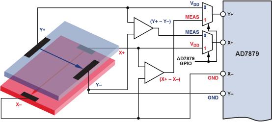 在后半周期中,將一個(gè)直流電壓施加于下層(有源層),并測(cè)量Y+引腳的電壓(對(duì)應(yīng)于VX+ – VX–),以提供與X方向上的運(yùn)動(dòng)(接近還是分開(kāi))相關(guān)的信息。