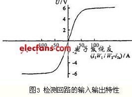 檢測回路的輸入輸出特性見圖3。補償回路開環(huán)特性隨著直流磁勢的增加趨于飽和,由于一次被測直流磁勢絕大部分被二次直流磁勢自動平衡掉,剩余磁勢很小,補償回路的開環(huán)特性可近似看成一條過原點的直線。以(I1W1/W2-I2s)為橫坐標x,以U為縱坐標y,可得:y=0.14461x。