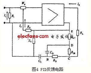 輸出的電流經過運算放大及驅動環(huán)節(jié)得到所需的補償電流磁勢I2eWe,運算放大環(huán)節(jié)在自動控制系統(tǒng)中屬于比例控制。比例控制的最大缺點是存在余差,當對控制質量有更高要求時,就需要在比例控制基礎上,再加上能消除余差的積分控制作用。微分控制系統(tǒng)中即使偏差很小,只要出現(xiàn)變化趨勢,就可馬上進行控制,有超前控制的特點,因此本文在差值電流補償回路中采用PID控制器。PID反饋電路如圖4所示,它既能快速進行控制,又能消除余差,具有較好的控制性能。比例積分微分控制規(guī)律為:
