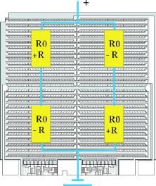 現(xiàn)代傳感器系統(tǒng)主要由兩個(gè)元件組成 —基本傳感器和信號(hào)處理專用集成電路 (ASIC)(圖 1)?,F(xiàn)已證明,后來(lái)由 Lord Klevin 于 1857 年發(fā)現(xiàn)的各向異性磁阻效應(yīng)特別適用于檢測(cè)磁場(chǎng)。首先考慮通常具有多種磁疇結(jié)構(gòu)的鐵磁性材料。這些稱之為韋斯磁疇的結(jié)構(gòu),其內(nèi)部磁化的方向彼此不同。如果將這種材料平鋪為一薄層,那么磁化矢量處于材料層平面方向。另外,可較精確地假設(shè)只存在一個(gè)磁疇。當(dāng)這種元件暴露于外部磁場(chǎng)中時(shí),后者會(huì)改變內(nèi)部磁化矢量的方向。如果同時(shí)一股電流通過(guò)該元件,就會(huì)產(chǎn)生電阻(圖 2),這取決于電流和磁化之間的角度。當(dāng)電流和磁化方向彼此成直角時(shí),電阻最小,當(dāng)二者平行時(shí),電阻最大。電阻變化的大小取決于材料。鐵磁性材料的性質(zhì)也決定對(duì)溫度的依賴性。電阻最大變化為 2.2% 并且對(duì)溫度變化反應(yīng)良好的最佳合金是 81% 的鎳和 19% 的鐵組成的合金。恩智浦所有傳感器系統(tǒng)中的基本傳感器都采用這種強(qiáng)磁鐵鎳合金。在惠斯登電橋電路中單獨(dú)配置幾個(gè) AMR 電阻,以增強(qiáng)輸出信號(hào)并改善溫度反應(yīng)特性。此電路也可在制造過(guò)程中進(jìn)行微調(diào)。圖 3 顯示如何在裸片上配置 AMR 元件。