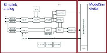 確定磁場(chǎng)之后是傳感器系統(tǒng)仿真。AMR 元件的電阻變化是各向異性磁阻效應(yīng)的直接結(jié)果。這樣,磁場(chǎng)仿真的結(jié)果會(huì)導(dǎo)致代表信號(hào)處理中輸入信號(hào)的電阻發(fā)生變化。對(duì)模擬前端進(jìn)行建??刹捎?Simulink。這種行為模型是概念設(shè)計(jì)的產(chǎn)物,標(biāo)志著產(chǎn)品開發(fā)的起點(diǎn)。每個(gè) Simulink 塊對(duì)應(yīng)一個(gè)模擬信號(hào)處理組件,例如放大器或過(guò)濾器。但是,尚未考慮模擬組件的控制部分,這由數(shù)字系統(tǒng)實(shí)現(xiàn)。HDL 設(shè)計(jì)則仿真通過(guò)數(shù)字方法實(shí)現(xiàn)的功能,而且在完成產(chǎn)品開發(fā)之后就會(huì)最終成形。因此,整體系統(tǒng)仿真是 Simulink 對(duì)模擬組件的行為模型以及 ModelSim 對(duì) HDL 設(shè)計(jì)的共同仿真(圖8)??赏ㄟ^(guò)仿真從概念階段順利過(guò)渡到 HDL 設(shè)計(jì)及后續(xù)階段。在共同仿真中,可用 ModelSim 中部署的 Verilog 代碼逐漸代替 Simulink 參考模型,從而可逐項(xiàng)驗(yàn)證 HDL 設(shè)計(jì)??沙掷m(xù)進(jìn)行此過(guò)程,直到在 Verilog 中實(shí)現(xiàn)整個(gè)數(shù)字部件,而模擬系統(tǒng)部件仍保持為 Simulink 模型。此工具組合也已證明對(duì) IC 評(píng)估同樣有用。自始至終使用這種工具可以更容易理解 IC 行為,并可創(chuàng)建用來(lái)分析和解釋任何錯(cuò)誤的框架。這些工具的主要好處在于,能夠更快速、更準(zhǔn)確地答復(fù)客戶的查詢,以及更好地了解與環(huán)境條件相關(guān)的傳感器功能。