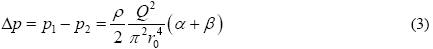 通過上式可以通過壓差來計算流量,為了平衡擴張和壓縮作用以及盡量減少能量損失,當θ=7°,φ=0.13,ζ=0.02,且流量Q為 61.1L/min,即在該管徑下流速為1m/s時,對異徑管尺寸進行優(yōu)化為:a=0.4r0,b=0.8r0,a=2.9264,b=3.1109,α+β=6.0373,α/β=0.9407