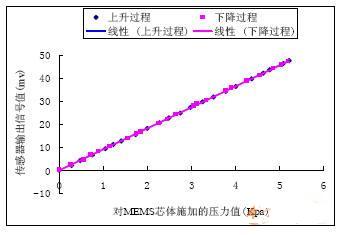 在進行實驗研究時,選取了一種壓阻式MEMS微型壓差敏感芯體,在組裝傳感器之前,采用了FLUKE 718 10G型壓力校準儀(Pressure Calibrator)對芯體進行標定。FLUKE 718 10G型壓力校準儀通過其自帶的一個主氣泵和一個微調(diào)氣泵可以輸出穩(wěn)定的-12~30psi(-83~207KPa)氣壓,精度達到±0.05%滿量程。實驗所用的MEMS芯體額定工作壓力量程為6KPa(安全工作壓力十倍于滿量程),在10.00+/-0.01V激勵電壓下,用FLUKE壓力校準儀標定結(jié)果如下: