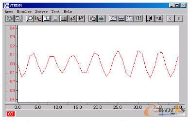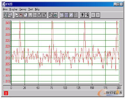 在動態(tài)試驗中,保持液壓泵提供20L/min的工作流量,使用Wavebook512信號系統(tǒng)對MEMS傳感器輸出流量信號進行采集,如圖7所示。盡管受到系統(tǒng)內(nèi)閥口、管路等造成的干擾,而且由于柱塞泵各柱塞在制造、安裝以及使用中產(chǎn)生的誤差和磨損造成的不均勻現(xiàn)象,導致流量波動曲線有些變形,但是還是可以很清晰的看出流量的波動周期約為60ms,即頻率16.7Hz。由于電動機工作在50Hz頻率,額定轉(zhuǎn)速1000r/min,因此相應(yīng)的軸向柱塞泵運轉(zhuǎn)頻率也是1000/60=16.7Hz,這正與上面的測量結(jié)果吻合。
