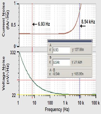 在第一項中,如果INA≈0.3 fA/√HZ ,且RFB =540MΩ,則該項對輸出噪聲的貢獻值約為160nV/√HZ /5.85=28nV/√HZ .
