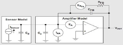 信號調(diào)節(jié)電路必須具有非低的輸入阻抗,以收集傳感器的大部分電荷輸出。因此,電荷放大器是理想的解決方案,因為只要放大器在這些信號頻率下保持高增益,其輸入便會讓傳感器信號出現(xiàn)虛擬接地。換句話說,如果傳感器的任何電荷想要在傳感器陽極(Cd)或者放大器輸入寄生電容(Ca)上增大,在放大器輸入端就會形成電壓。通過拉或吸取相同量的負反饋網(wǎng)絡電荷電流,即RFB和CFB,這種電壓便立即得到了補償。