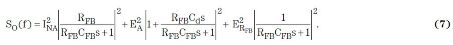 現(xiàn)在,請思考噪聲變化與反饋電阻的對比結果。將方程式7第一項的RFB從270 MΩ改為540MΩ(且把CFB除以2,從680 pF降至340pF,目的是保持極頻恒定),對輸出參考噪聲產(chǎn)生如下影響: