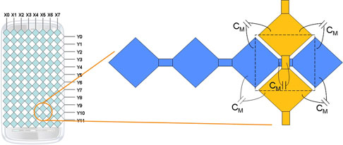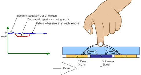 電容感測含有數(shù)個層:頂層是玻璃或塑膠材質,接者依序是一個光學透明膠(OCA)層、觸控感測器及平面液晶顯示器(LCD)。觸控感測器是由許多感測元件所排列而成的網格,尺寸通常為5毫米×5毫米。