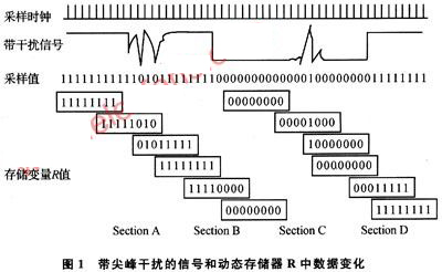 從單片機計數(shù)輸入端,觀察信號波形。為便于分析,在高、低電平段設(shè)置了幾個干擾尖峰脈沖,分別標示為Section A和Section C,占空比信號下降沿、上升沿分別標示為Section B和Section D。單片機按計數(shù)時鐘周期性采樣,采樣值中“1”表示采到的是高電平,“0”表示低電平。I/O口采樣占空比信號輸出端口中狀態(tài),利用1個字節(jié)型變量R來動態(tài)存儲采樣值。控制器每采樣1次,變量R中數(shù)據(jù)向左移1個二進制位,R原最高位電平狀態(tài)被移除,而當前時刻新的采樣狀態(tài)保存到R的最低位,變量R被更新了,狀態(tài)存儲器R中保存著最近8個采樣周期的采樣值。
