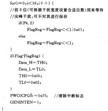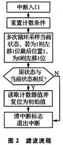根據(jù)軟件濾波設(shè)計思想,濾波子程序由主程序在信號狀態(tài)發(fā)生變化,進入中斷時調(diào)用,圖2給出了濾波程序流程。對照圖1中4種Section來分析流程圖。當有邊沿或干擾信號(信號周期大于計數(shù)時鐘周期)到來時,VRS51L3074單片機的PWC計數(shù)停止條件滿足,系統(tǒng)進入中斷服務子程序。在中斷子程序中,首先重置脈寬計數(shù)條件,然后對當前狀態(tài)進行采樣,采樣1次,狀態(tài)寄存器左移1位,采樣到高電平記為“1”,采樣到低電平記為“0”。如正常下降沿Section B,前面處于高電平段,初始狀態(tài)變量Flag全為1,當出現(xiàn)低電平,控制器進人中斷,緊接著進行16次采樣。前已提及系統(tǒng)處理的尖峰干擾約1~2 ms,每個采樣周期約為0.4 ms,其尖峰干擾脈寬達不到8個采樣周期。系統(tǒng)設(shè)計時采樣16次,只取最后8次的存儲狀態(tài)與原狀態(tài)進行比較,如果最后采樣的狀態(tài)全為“0”則與原狀態(tài)相反,就可判斷出這是1個正常下降沿。如果是干擾信號引起計數(shù)中斷,前面8個采樣狀態(tài)不全為“1”,后面8個狀態(tài)全為“1”,最后采樣的狀態(tài)與原狀態(tài)相同,就可判斷出這是1個干擾信號,如Section A。在信號狀態(tài)采樣期間,計數(shù)條件滿足PWC繼續(xù)計數(shù),直到真正的下降沿到來,計數(shù)停止并保存,計數(shù)寄存器還原為初始值,這樣干擾信號即被濾除。類似地,正常上升沿Section D,存儲器原狀態(tài)為“0”,上升沿來臨后存儲器狀態(tài)為“1”,與原狀態(tài)相反,PWC計數(shù)停止并保存,計數(shù)寄存器還原為初始值,退出中斷子程序。有干擾信號出現(xiàn)后采樣狀態(tài)與原狀態(tài)相同,干擾尖峰脈沖可被濾除。如果要使脈寬計數(shù)更精確,可判斷前8個采樣周期中系統(tǒng)不正常計數(shù)的周期,然后與最終計數(shù)周期相加即可。此時,程序流程體現(xiàn)出軟件濾波功能。