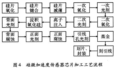 壓阻式傳感器的懸臂梁常采用CVD工藝在硅片上外延生長一層外延層刻蝕而成,文中試用鍵合工藝制造壓阻式加速度傳感器。采用鍵合工藝優(yōu)點是能得到高質(zhì)量的外延層,且懸臂梁的厚度通過硅片減薄工藝易于得到保證,精細的硅片單面研磨,厚度誤差可以控制在0.5 μm以內(nèi);且不需要電化學自停止腐蝕,依靠EPW腐蝕液對SiO2的腐蝕速度極慢,使得腐蝕過程停止在SiO2層上,從而保證了硅片減薄后的厚度即為彈性梁的厚度。制作的傳感器芯片尺寸3 mm×5 mm,封裝在陶瓷管殼中。選n型硅片,晶向(100),直徑為50mm,厚度為300μm,電阻率為5~12 Ω·cm。傳感器芯片加工工藝流程,如圖4所示。