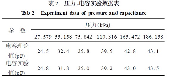 從表1 可見,擬合的電容誤差小于1 %。由此可見,在不同的時刻測得UO ( t) ,通過曲線擬合得出參數(shù)RC。再給電路加小信號直流電源,測出R 值,即求得C ,通過C 值則可知被測環(huán)境的壓力。圖5為350 ℃時,不同的壓力所對應(yīng)的電容的理論值和實驗值,從實驗數(shù)據(jù)(表2) 可得,在測壓的過程中,利用模型識別的方法,誤差較小,其測壓誤差小于2 %。