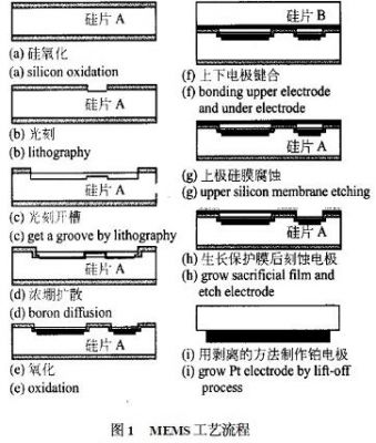 硅電容式壓力傳感器的敏感元件是半導(dǎo)體薄膜,它可以由單晶硅、多晶硅等利用半導(dǎo)體工藝制作而成。典型的電容式傳感器由上下電極、絕緣體和襯底構(gòu)成。當(dāng)薄膜受壓力作用時(shí),薄膜會(huì)發(fā)生一定的變形,因此,上下電極之間的距離發(fā)生一定的變化,從而使電容發(fā)生變化。但電容式壓力傳感器的電容與上下電極之間的距離的關(guān)系是非線性關(guān)系,因此,要用具有補(bǔ)償功能的測量電路對輸出電容進(jìn)行非線性補(bǔ)償。由于高溫壓力傳感器工作在高溫環(huán)境下,補(bǔ)償電路會(huì)受到環(huán)境溫度的影響,從而產(chǎn)生較大的誤差?;谀P妥R別的高溫壓力傳感器,正是為了避免補(bǔ)償電路在高溫環(huán)境下工作產(chǎn)生較大誤差而設(shè)計(jì)的,其設(shè)計(jì)方案是把傳感器件與放大電路分離,通過模型識別來得到所測環(huán)境的壓力。高溫工作區(qū)溫度可達(dá)350℃。傳感器件由鉑電阻和電容式壓力傳感器構(gòu)成。其MEMS工藝如下: