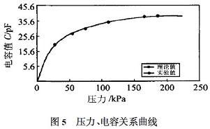1可見,擬合的電容誤差小于1%。由此可見,在不同的時(shí)刻測得UO(t),通過曲線擬合得出參數(shù)RC。再給電路加小信號直流電源,測出R值,即求得C,通過C值則可知被測環(huán)境的壓力。圖5為350℃時(shí),不同的壓力所對應(yīng)的電容的理論值和實(shí)驗(yàn)值,從實(shí)驗(yàn)數(shù)據(jù)(表2)可得,在測壓的過程中,利用模型識別的方法,誤差較小,其測壓誤差小于2%。