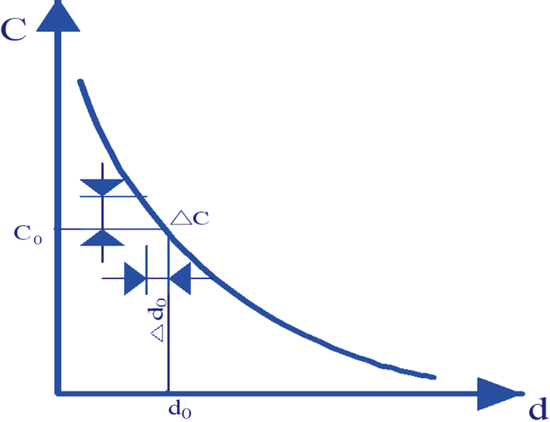 圖2 變間隙式電容傳感器的C-d特性曲線圖