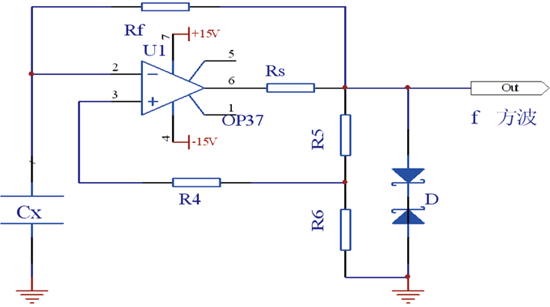 傳統(tǒng)的電容檢測方法有電荷轉(zhuǎn)移法和脈寬調(diào)制法,電荷轉(zhuǎn)移法常用于單電容檢測,脈寬調(diào)制法常用于差分電容檢測。圖3是方波發(fā)生器電路,產(chǎn)生的方波頻率