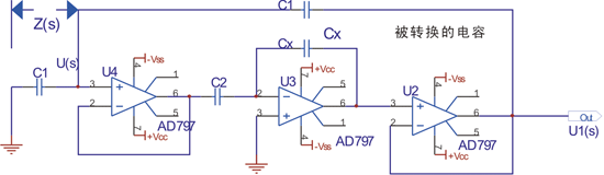 。如果 Rf 為常數(shù),則f是Cx(x)函數(shù),可根據(jù)測定f占空比,計(jì)算出Cx(x)的值。實(shí)際上,圖3電路僅可測量靜態(tài)電容,對(duì)于測量動(dòng)態(tài)電容,必須對(duì)電路進(jìn)行改進(jìn), 對(duì)Cx的電荷轉(zhuǎn)移過程進(jìn)行保護(hù)。改進(jìn)的方法是用電容性有源網(wǎng)絡(luò)在電路中來代替Cx,如圖4所示。U3是電荷轉(zhuǎn)移放大器,是網(wǎng)絡(luò)的中心;U2是跟隨器;U4是保持器,電路靜態(tài)諧振頻率以38KHz~40KHz為好。
