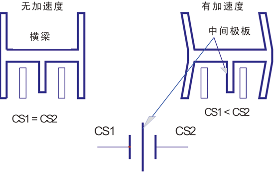 如圖5所示,中間極板(即橫梁的伸出部分)與二個(gè)固定的外極板組成差動(dòng)電容 CS1和CS2。沒有加速度時(shí),CS1=CS2;產(chǎn)生加速度時(shí),橫梁的移動(dòng)改變了中間極板和固定的外極板之間的相對(duì)位置,引起電容變化,CS1≠CS2。通過測量電路,將電容的變化在外加交流電壓的激勵(lì)下轉(zhuǎn)化為電學(xué)量,能夠測得該物體相應(yīng)的瞬時(shí)速度或瞬時(shí)加速度值。
