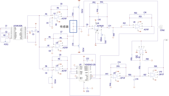 具體電路如圖7所示:U0(MAX038)信號(hào)發(fā)生器芯片產(chǎn)生1MHz的正弦交流信號(hào);U1(AD797)運(yùn)算放大器組成反相比例放大器,U2(AD797)運(yùn)算放大器組成同相比例放大器。1MHz的交流信號(hào)經(jīng)U1、U2后,變?yōu)榇笮∠嗟取⒎较蛳喾?、相位相?80o的二個(gè)交流激勵(lì)信號(hào),用來激勵(lì)差分電容傳感器;U4(AD745JR)是高輸入阻抗電荷轉(zhuǎn)移放大器。U4是調(diào)理電路的中心,在外加激勵(lì)信號(hào)的作用下,傳感器振動(dòng)引起的電荷轉(zhuǎn)移成電壓信號(hào)的變化。R12、R13、R14采用T型連結(jié),目的是提升電路阻抗和電路系統(tǒng)放大倍數(shù)。U6(AD797)運(yùn)算放大器是 將C11、R16組成的高通濾波器去除低頻干擾后的電壓信號(hào)經(jīng)適當(dāng)放大,為下一步同步解調(diào)作好準(zhǔn)備;U3(AD797)運(yùn)算放大器組成的移相電路,其作用是使調(diào)制信號(hào)和解調(diào)信號(hào)同步;U5同步解調(diào)器,采用ADI公司生產(chǎn)的平衡解調(diào)器AD630,經(jīng)U5同步解調(diào)出的電壓信號(hào)就是反應(yīng)振動(dòng)加速度大小的信號(hào);U9(OP137)運(yùn)算放大器組成二階有源低通濾波器,濾除信號(hào)中高頻噪音成份;U10(OP177)運(yùn)算放大器組成 跟隨器,信號(hào)經(jīng)調(diào)整后跟隨輸出。