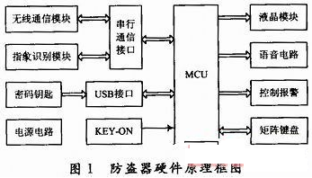 主要工作原理如下:車(chē)主停車(chē)熄火后,防盜器進(jìn)入鎖定狀態(tài)。此時(shí)如果汽車(chē)鑰匙不在ON位,就不能進(jìn)行指紋識(shí)別;只有當(dāng)汽車(chē)鑰匙在ON位,才可用指紋識(shí)別解鎖防盜器并自動(dòng)點(diǎn)火。在鎖定狀態(tài)下,汽車(chē)的油路、電路等被切斷,汽車(chē)鑰匙無(wú)法點(diǎn)火;如果強(qiáng)行剪斷指紋采集模塊和控制盒的連線,或者不識(shí)別指紋而強(qiáng)行用汽車(chē)鑰匙點(diǎn)火,汽車(chē)會(huì)通過(guò)鳴號(hào)、閃燈和無(wú)線通信網(wǎng)絡(luò)報(bào)警。在鎖定狀態(tài)插入密碼鑰匙可進(jìn)入解鎖狀態(tài),并可根據(jù)LCD和語(yǔ)音提示通過(guò)小鍵盤(pán)進(jìn)行指紋注冊(cè)/刪除、手機(jī)號(hào)碼設(shè)置和應(yīng)急點(diǎn)火等操作。