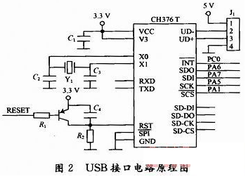 USB接口電路主要由文件管理控制芯片CH376T實(shí)現(xiàn),CH376T支持USB設(shè)備方式和USB主機(jī)方式,并且內(nèi)置了USB通信協(xié)議的基本固件、處理MassStorage海量存儲(chǔ)設(shè)備的專用通信協(xié)議的固件、SD卡的通信接口固件、FAT16和FAT32以及FAT12文件系統(tǒng)的管理固件,支持常用的USB存儲(chǔ)設(shè)備和SD卡。CH376T支持二種通信接口:SPI接口和異步串口。本設(shè)計(jì)采用SPI接口與MCU進(jìn)行數(shù)據(jù)通信,電路連接方式如圖2所示。串行數(shù)據(jù)輸入SDI、輸出SDO和時(shí)鐘SCK分別接STM32F103VC的SPI1_MOSI,SPI1_MISO和SPI1_SCK,中斷請(qǐng)求輸出端INT接PC0,片選端SCS由PA1控制。圖2中的RESET是系統(tǒng)復(fù)位信號(hào),晶體振蕩器Y1選12 MHz。當(dāng)車(chē)主要進(jìn)行指紋注冊(cè)/刪除或應(yīng)急點(diǎn)火時(shí),將密碼鑰匙(U盤(pán))接入J1以讀取密碼信息。