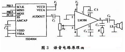 語(yǔ)音電路原理圖如圖3所示,由美國(guó)ISD公司的語(yǔ)音芯片ISD4004-16和美國(guó)國(guó)家半導(dǎo)體公司的音頻功率放大器LM386等元件構(gòu)成。ISD4004 -16錄放時(shí)間為16 min(可分段),它采用CMOS技術(shù),單電源3 V工作,內(nèi)含振蕩器、抗混疊濾波器、平滑濾波器、音頻放大器、自動(dòng)靜噪及高密度多電平閃爍存貯陳列。它內(nèi)置微控制器SPI總線串行通信接口??蓪⒛M語(yǔ)音數(shù)據(jù)直接寫(xiě)入單個(gè)存儲(chǔ)單元,不需通過(guò)A/D或D/A轉(zhuǎn)換。使得ISD語(yǔ)音電路具有音質(zhì)自然、使用方便、單片存儲(chǔ)、反復(fù)錄放、低功耗、抗斷電等許多優(yōu)點(diǎn)。LM386工作電壓范圍寬,電壓增益可調(diào)。具有自身功耗低、電壓增益可調(diào)整電源電壓范圍大、外接元件少和總諧波失真小等特點(diǎn)。本設(shè)計(jì)中STM32F103VC通過(guò)SPI2給ISD4004傳送語(yǔ)音信息。圖3中的V1和V2分別經(jīng)三極管與+3.3 V和+12 V電源相連,三極管的通斷由STM32F103VC的PCI1和PCI2控制,只有在需要語(yǔ)音提示時(shí),才使三極管導(dǎo)通給ISD4004和LM386供電。