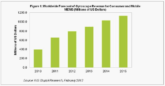 據(jù)IHS iSuppli公司的MEMS市場(chǎng)追蹤報(bào)告,由于蘋果iPhone和iPad去年第四季度創(chuàng)出最高銷量紀(jì)錄,2011年陀螺儀成為消費(fèi)與移動(dòng)MEMS領(lǐng)域中的創(chuàng)收大戶。