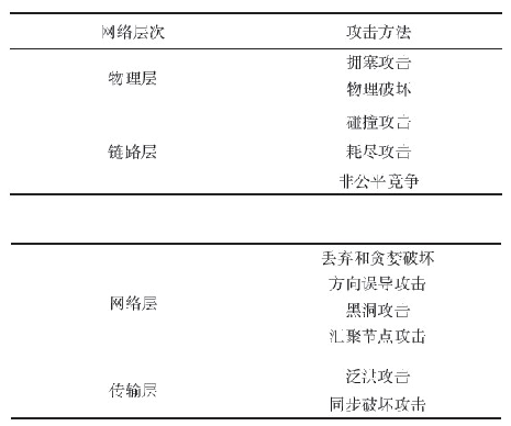 無(wú)線傳感器網(wǎng)絡(luò)(WSN)易受各種安全威脅,許多文獻(xiàn)勻有描述。文獻(xiàn)將WSN的攻擊按照不同層次分類(lèi),如表1所示。