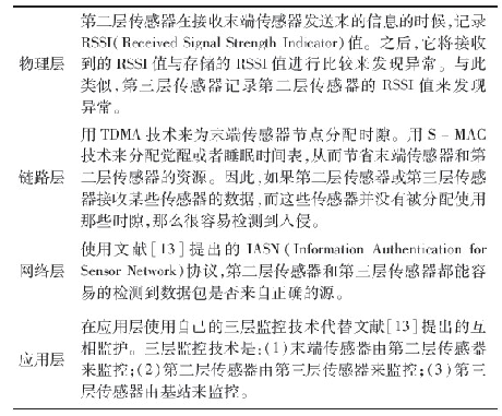 修改了Da Silva等人提出的入侵檢測(cè)算法,并將它運(yùn)用在第二和第三層傳感器上。由于傳感器資源有限,沒(méi)有在任何末端傳感器上運(yùn)用IDS.監(jiān)控節(jié)點(diǎn)的功能被分成三個(gè)階段。第一階段:所有的末端傳感器從它們周?chē)h(huán)境收集數(shù)據(jù),然后報(bào)告給第二層傳感器。第二階段:用基于分層的攻擊檢測(cè)方法來(lái)檢測(cè)文獻(xiàn)提出的攻擊類(lèi)型。表2描述了攻擊在各層中如何被發(fā)現(xiàn)的。這種基于分層的攻擊檢測(cè)方法使得系統(tǒng)更完善。第三階段:比較每個(gè)上報(bào)的結(jié)果來(lái)定義閾值,以此來(lái)決定是否要發(fā)出一個(gè)報(bào)警。第三階段常??梢詼p少錯(cuò)報(bào)率。閾值可以人工定義或者根據(jù)特定的WSN需求來(lái)調(diào)整。因此,提出的入侵檢測(cè)體系結(jié)構(gòu)通過(guò)減少錯(cuò)報(bào)能夠檢測(cè)到大多數(shù)的安全威脅。
