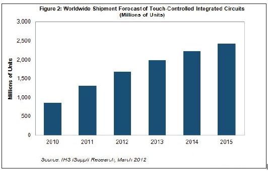 在蘋果公司iPhone和iPad暢銷的推動下,智能手機和媒體平板中的觸控屏急劇增長,從而導(dǎo)致觸摸控制器集成電路(IC)出貨量在短短五年內(nèi)將增長近兩倍。