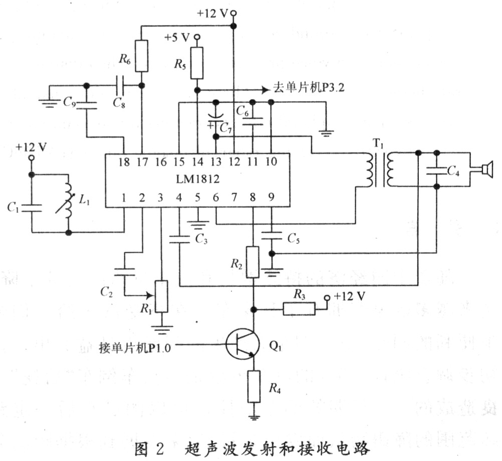 超聲波發(fā)射和接收電路如圖2所示。當(dāng)LM1812的8腳為高電平時,LM1812處于發(fā)射模式;當(dāng)8腳為低電平時,LM1812處于接收模式。值得注意的是,單片機到LM1812的連接要進行5~12 V的電平轉(zhuǎn)換。當(dāng)LM1812處于發(fā)射模式時,L1,C1振蕩槽路被切換為振蕩模式,振蕩信號經(jīng)驅(qū)動放大后,由13腳及6腳輸出。6,13腳之間所接變壓器線圈的匝數(shù)比是根據(jù)TCF40-25TR1型收發(fā)一體式超聲波傳感器的阻抗來確定的。實驗證明,變壓器線圈的匝數(shù)比大約為4:1時可實現(xiàn)與超聲波發(fā)送器阻抗相匹配。超聲波接收器接收到的超聲波信號經(jīng)電容耦合由4腳輸入,再經(jīng)內(nèi)部兩級放大后同由1腳的諧振回路取出的信號一起送到檢測器。當(dāng)檢測到超聲波回波信號時,LM1812的14腳(與單片機的INT0端相連)變?yōu)榈碗娖?,使單片機的T0計數(shù)器停止計數(shù)。