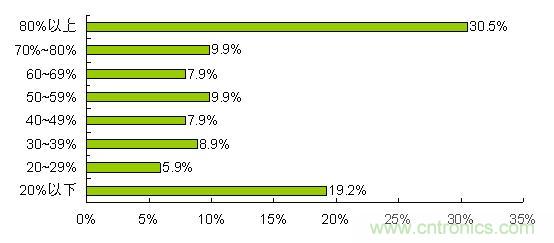 根據(jù)調(diào)查,89%的公司2011年傳感器采購總額在5千萬以下,其中采購總額在1千萬以下的占到69%。采購傳感器進(jìn)口產(chǎn)品所占百分比呈現(xiàn)兩極分化,進(jìn)口產(chǎn)品所占百分比在80%以上和20%以下的情況最多,有30.5%的整機(jī)制造商傳感器進(jìn)口產(chǎn)品達(dá)到80%以上,19.5%的公司進(jìn)口產(chǎn)品在20%以下。