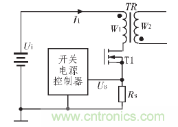 開關(guān)電源從控制方式上可分為電壓控制型和電流控制型,從隔離變壓器的驅(qū)動(dòng)方式上可分為單端型和雙端型。在這些電路形式中, 許多形式的開關(guān)電源需要使用電流傳感器檢測(cè)電流,或者用于脈沖占空比的控制,或者用于電路的保護(hù)。電流控制型開關(guān)電源直接對(duì)輸入的脈沖電流進(jìn)行檢測(cè),能同時(shí)根據(jù)輸入電壓和輸出電壓的變化綜合調(diào)節(jié)脈沖占空比,具有動(dòng)態(tài)響應(yīng)速度快,輸入電壓的波動(dòng)對(duì)輸出電壓影響小等特點(diǎn)。電流控制型開關(guān)電源中需要電流傳感器檢測(cè)輸入的脈沖電流, 以作為開關(guān)電源調(diào)節(jié)脈沖占空比、穩(wěn)定輸出電壓的反饋信號(hào)。圖1 所示為一個(gè)電流控制型的反激式開關(guān)電源的輸入通道原理圖。圖中電阻RS在電路中的作用即是電流傳感器, 在功率開關(guān)T1導(dǎo)通時(shí), 流過(guò)隔離變壓器原邊繞組W1的電流Ii將使RS上產(chǎn)生電壓降US,US即為向開關(guān)電源控制器反饋的輸入電流值信號(hào)。根據(jù)輸出電壓反饋信號(hào)和輸入電流值反饋信號(hào)US, 開關(guān)電源控制器將綜合調(diào)節(jié)電路的脈沖占空比,保證輸出電壓的穩(wěn)定。